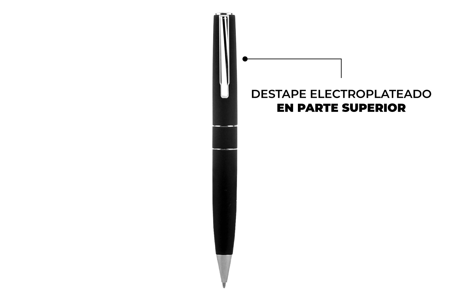 Metal. Cuerpo metálico engomado. Clip y detalles color plata. Estuche con cierre magnético. Tinta negra. Área de impresión: Ø 0,8 x 5 cm. Destape electroplateado en la parte superior. Presentación en estuche con cierre magnético.
