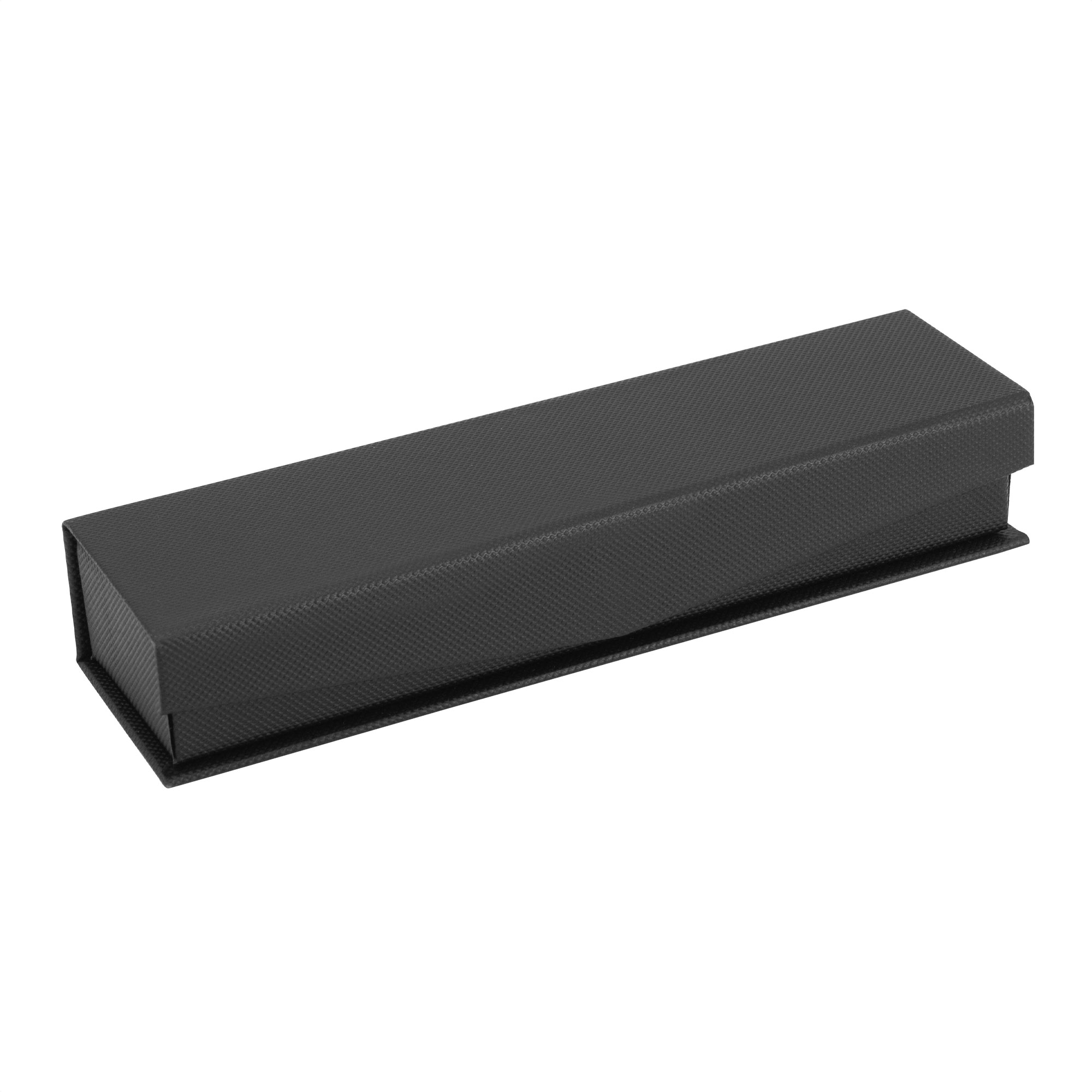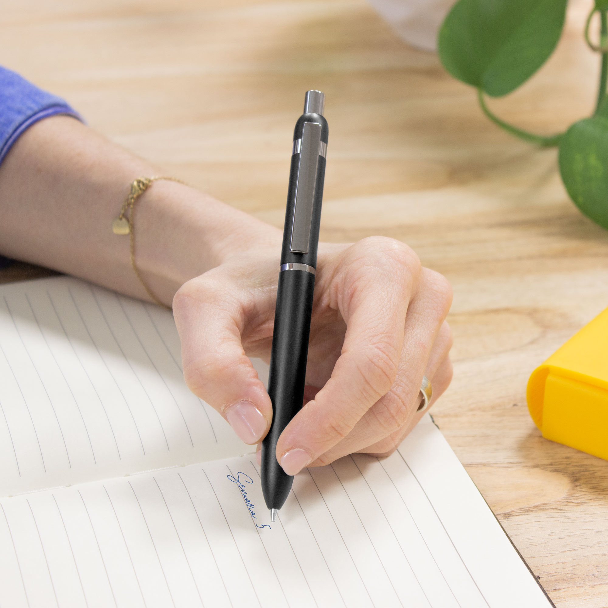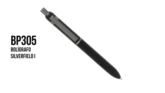 Metal. Cuerpo de aluminio. Bolígrafo retráctil. Clip, botón y anillos metálicos color plata. Tinta Negra. Destape electroplateado en ambas partes. Presentación en estuche con cierre magnético.