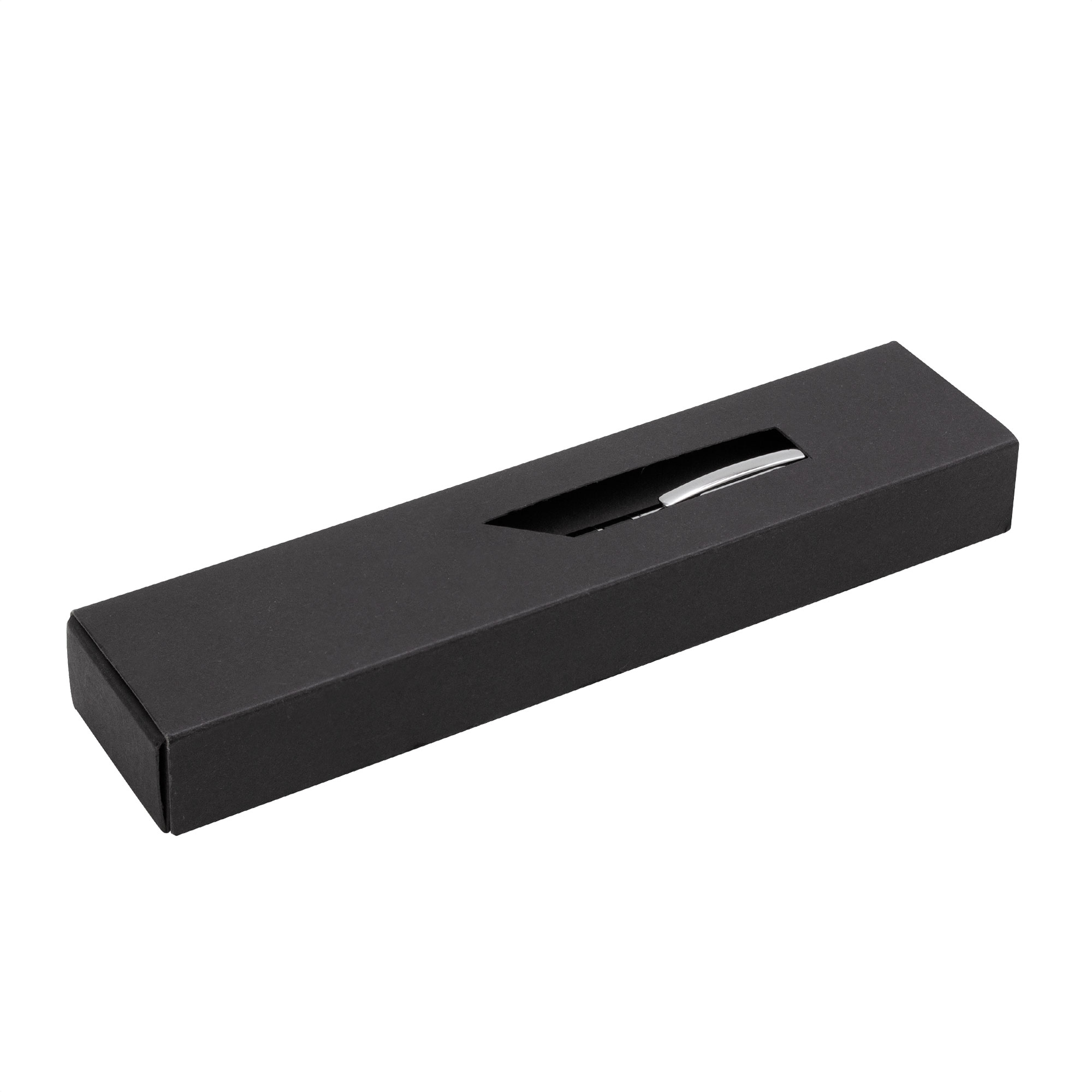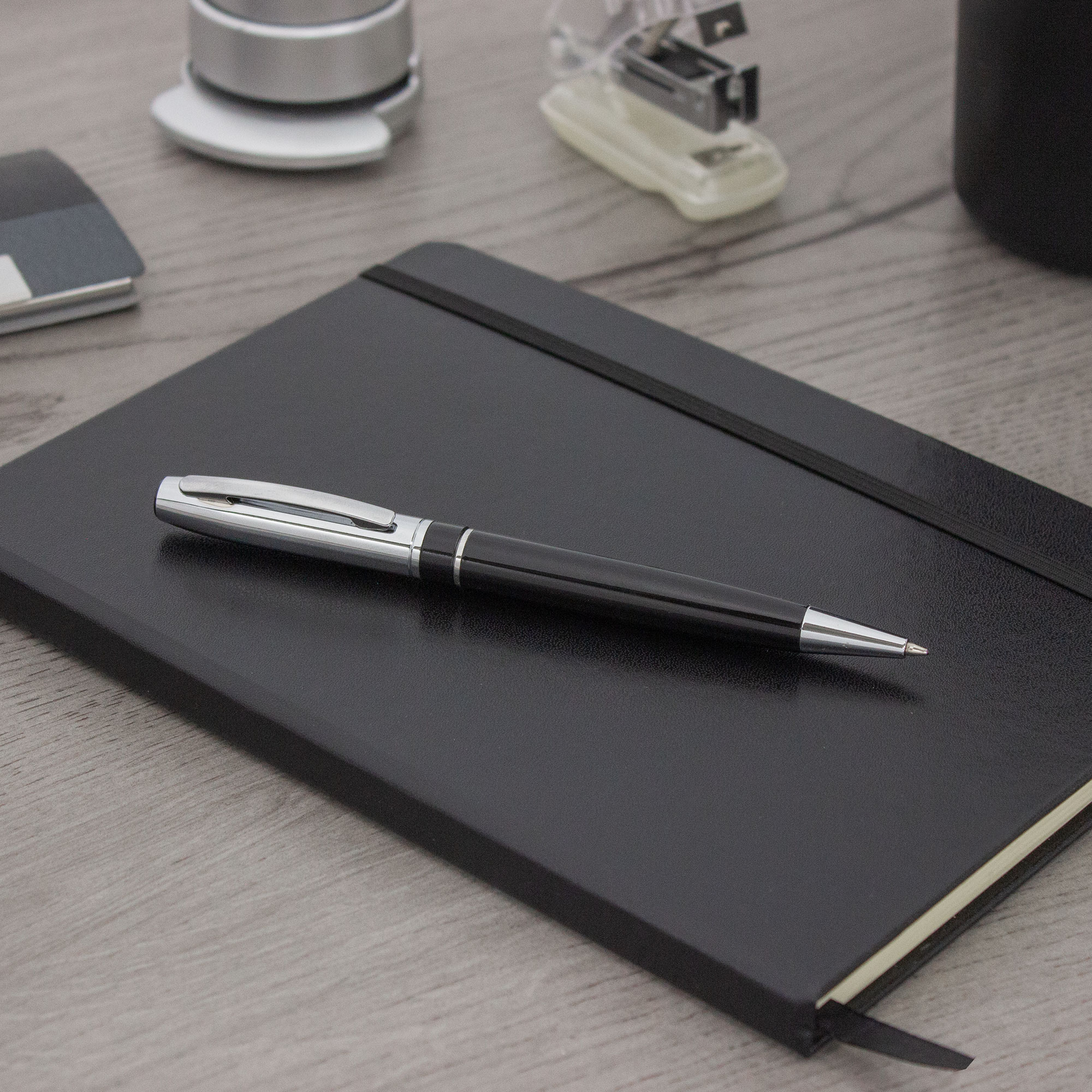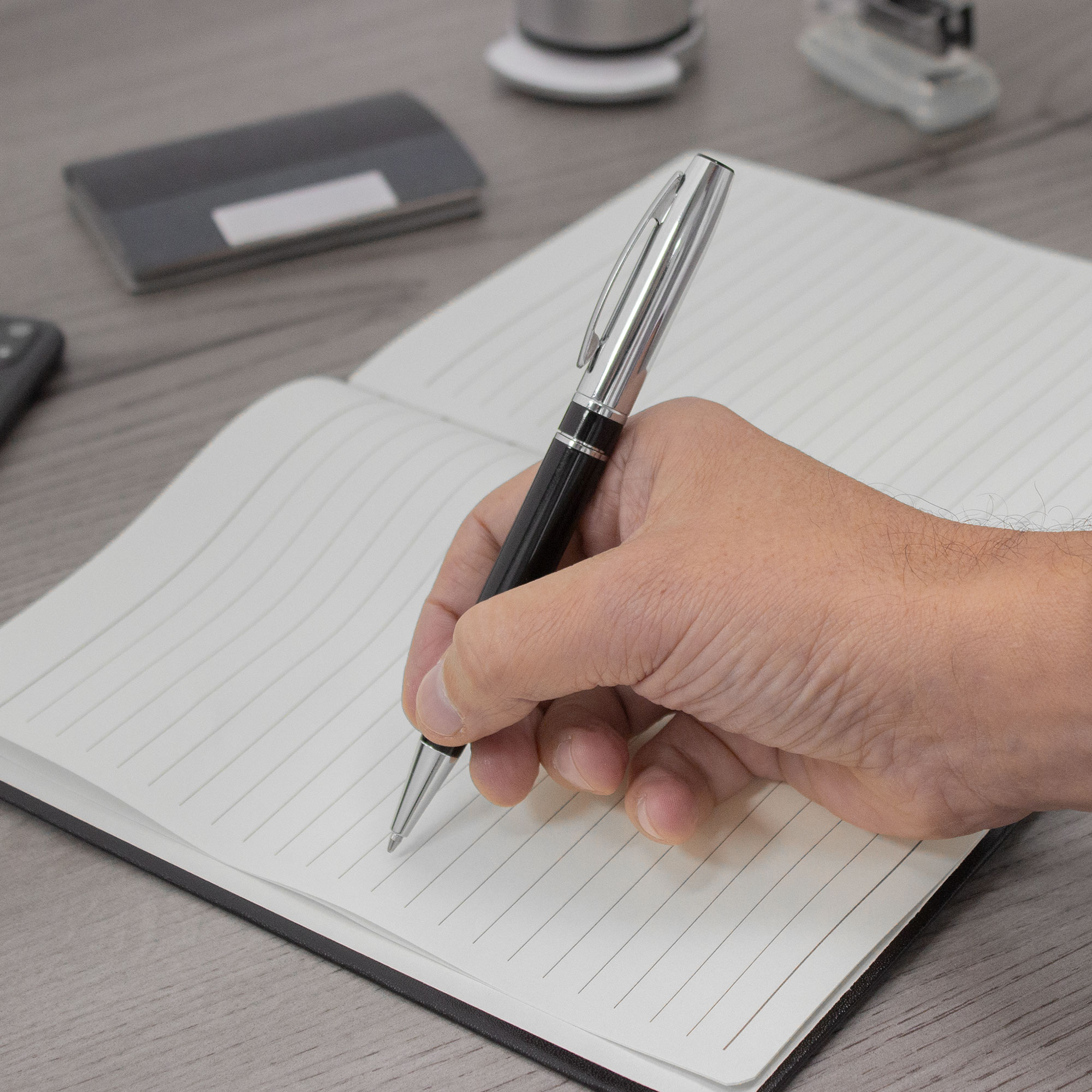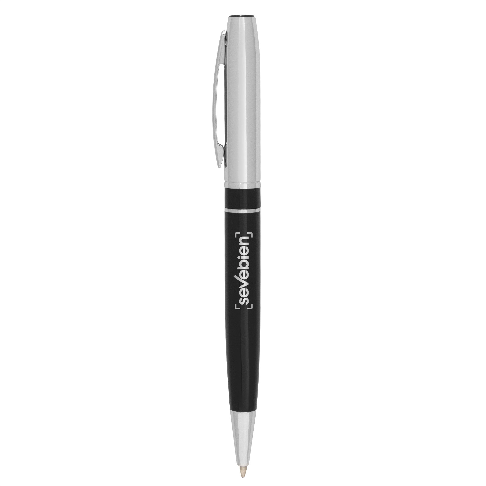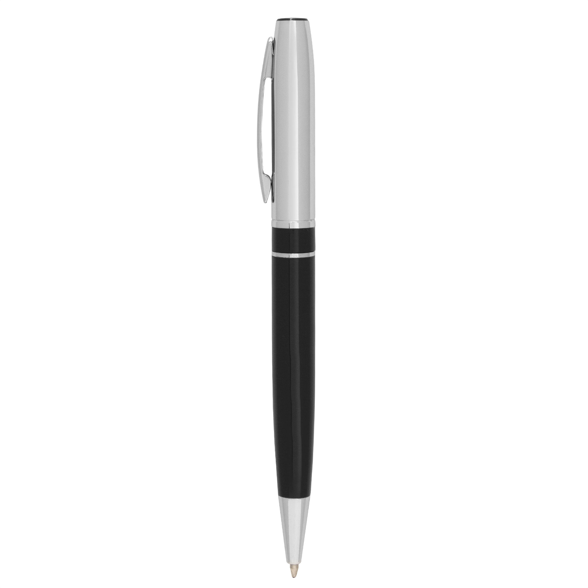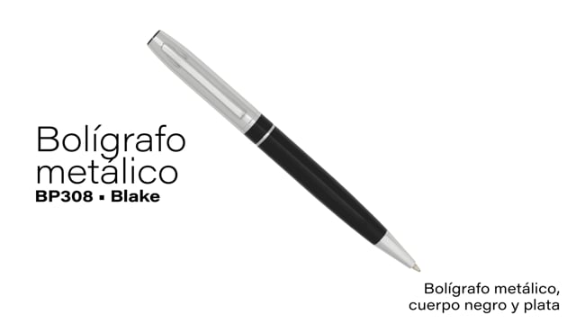 Bolígrafo con apertura giratoria. Cuerpo color negro. Tambor superior, clip, anillo y puntera color plata. Destape plata en la parte superior e inferior.