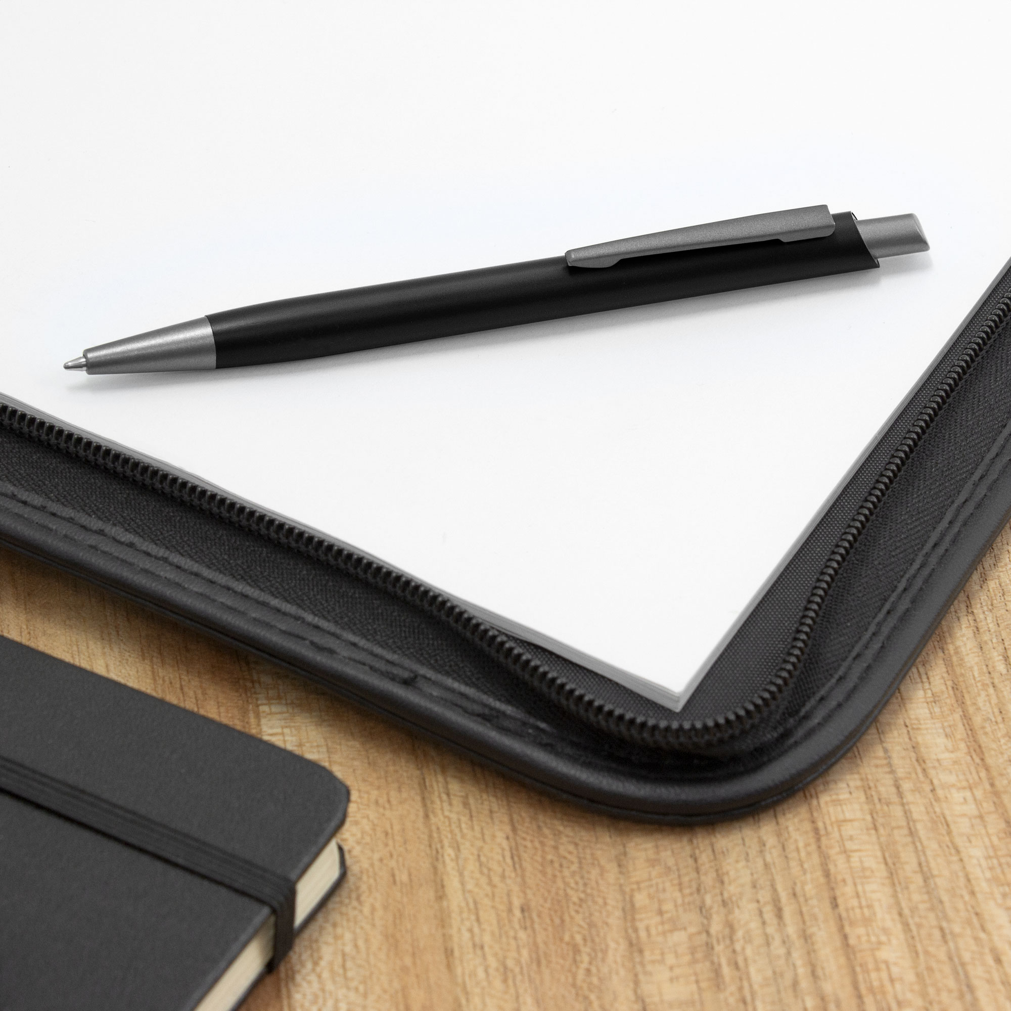 Aluminio, ABS, Acero. Boligrafo retráctil. Cuerpo revestido en laca de diferentes colores. Acabado mate. Pulsador, clip y puntera de color gris gun metal. Tinta negra. Amplia área de impresión.