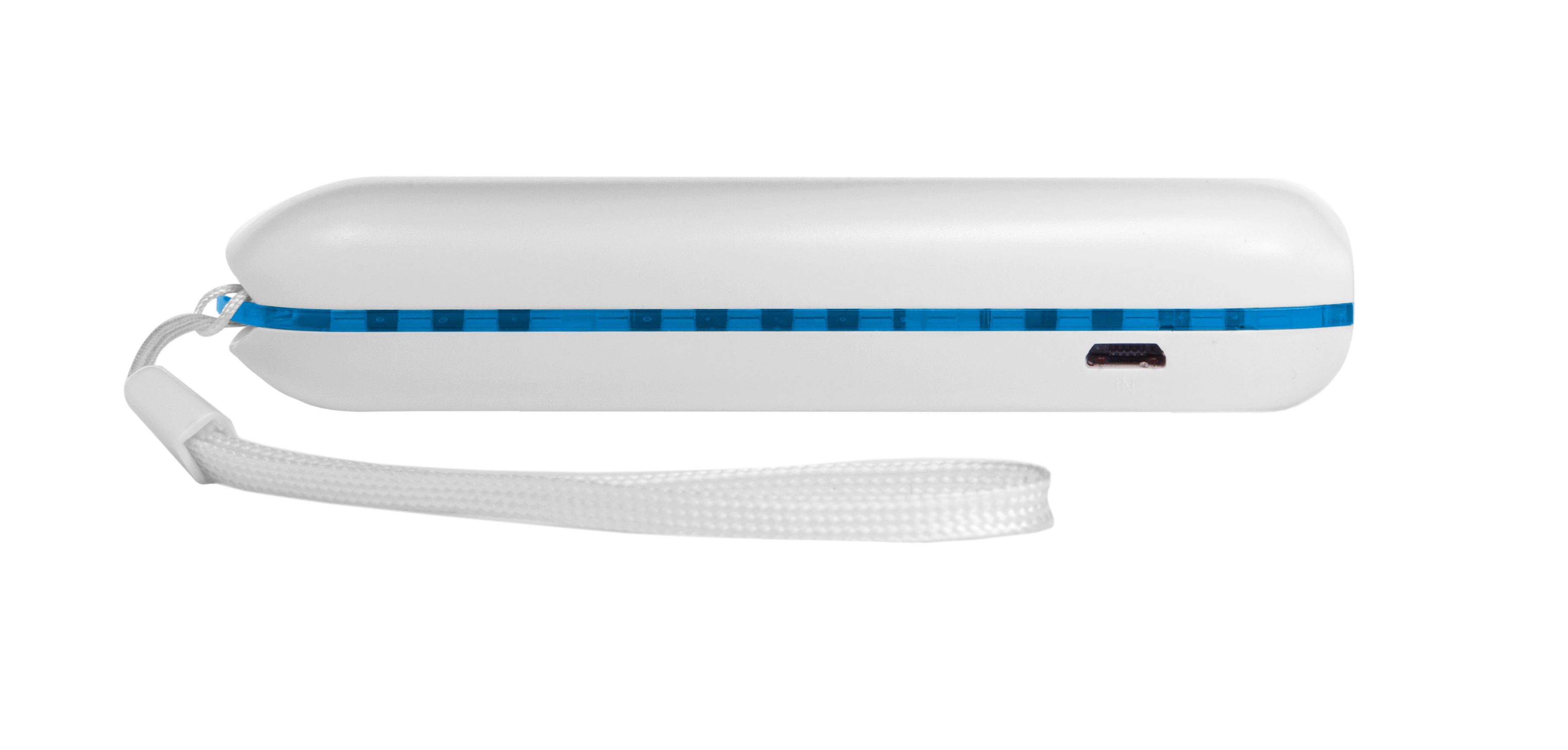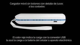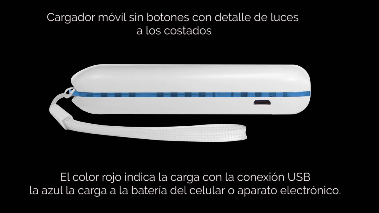 10,5 x 1,8 cm. Plástico. Capacidad 2200 MAH. Cargador móvil con luz en los costados que indica la carga de la batería. El color rojo indica la carga con la conexión USB y la azul la carga a la batería del celular o aparato electrónico. Posee cinta sujetadora. Con certificación de calidad.