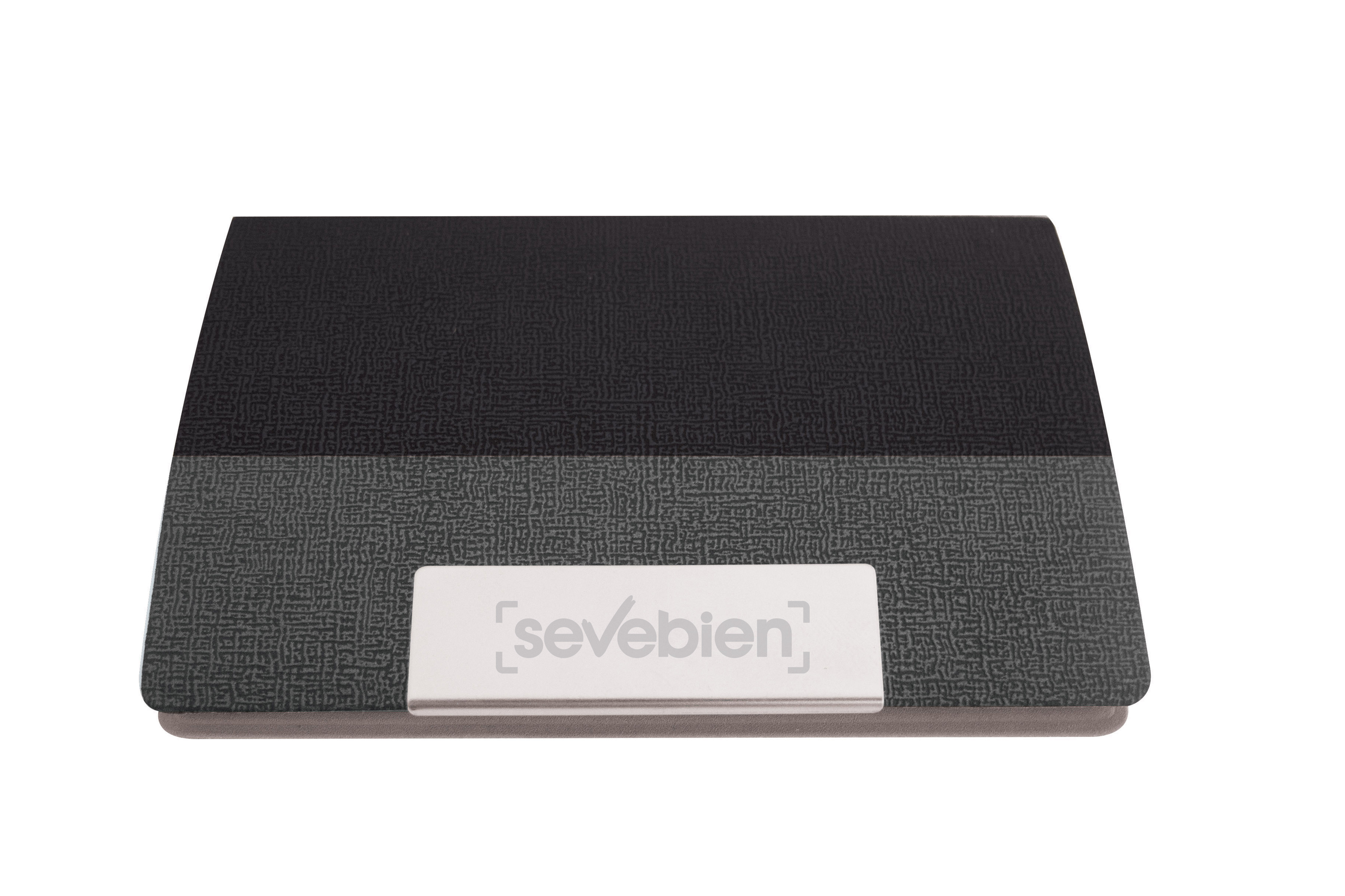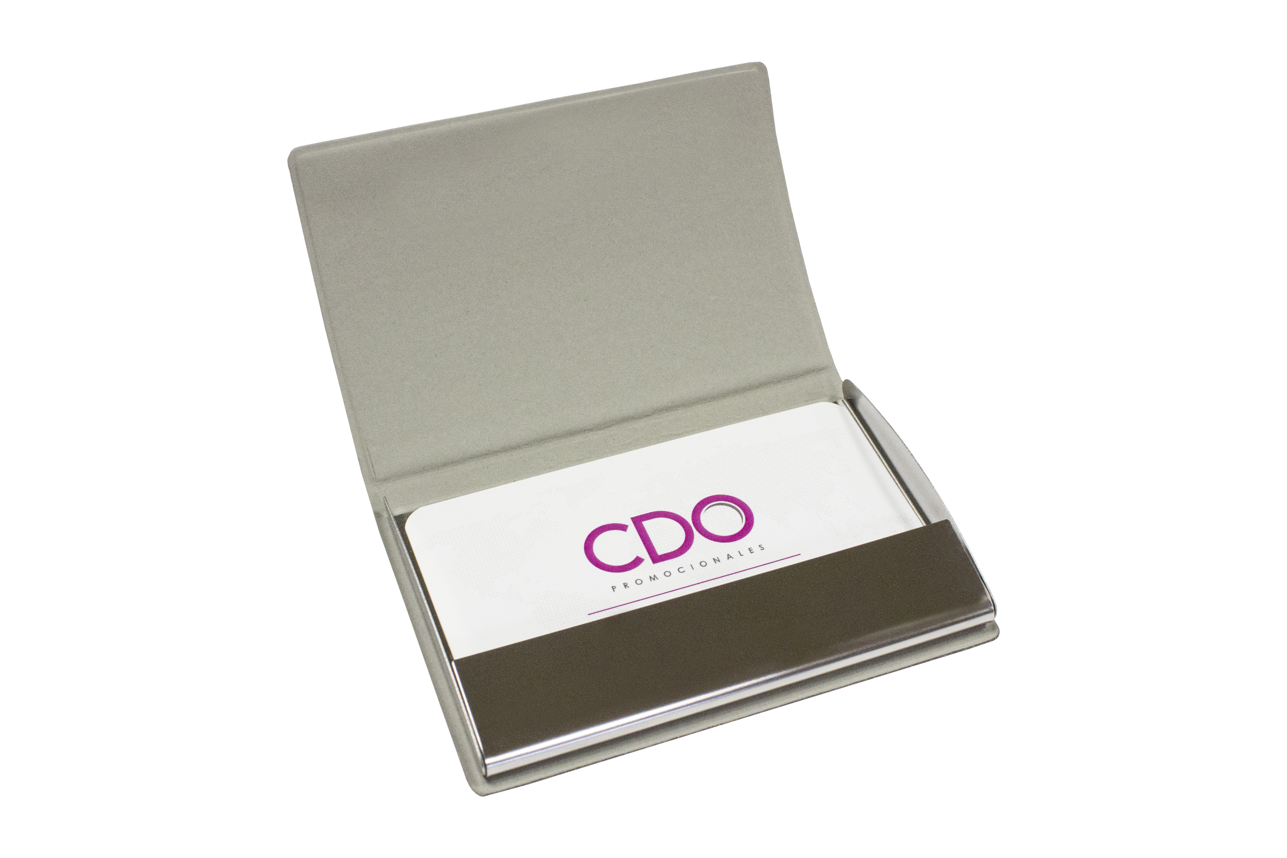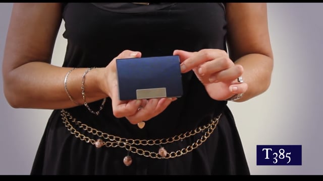 9,5 x 6,5 x 1,1 cm. Plástico y Metálico. Exterior de vinilo texturado con amplia placa metálica para impresión. Interior en metal. Cierre imantado.