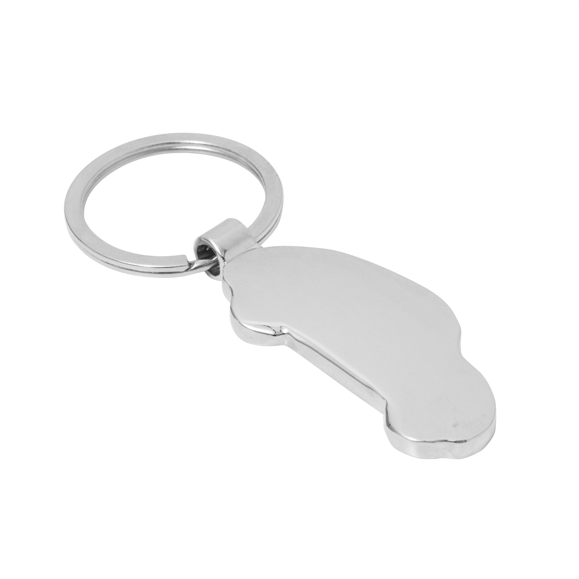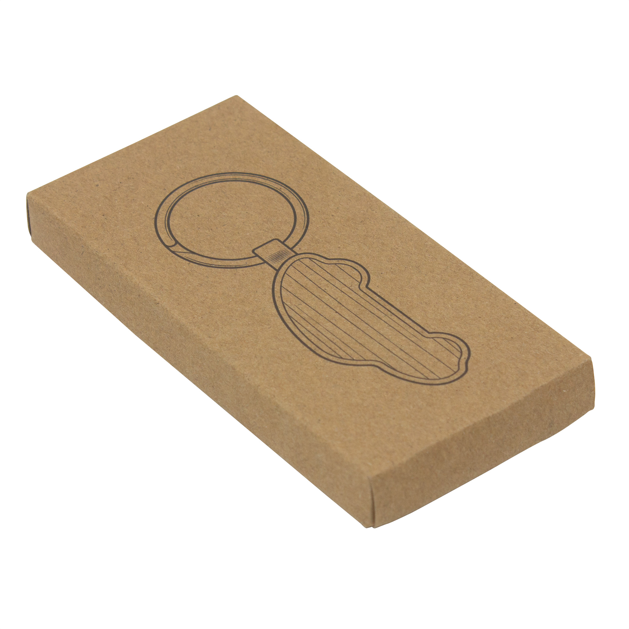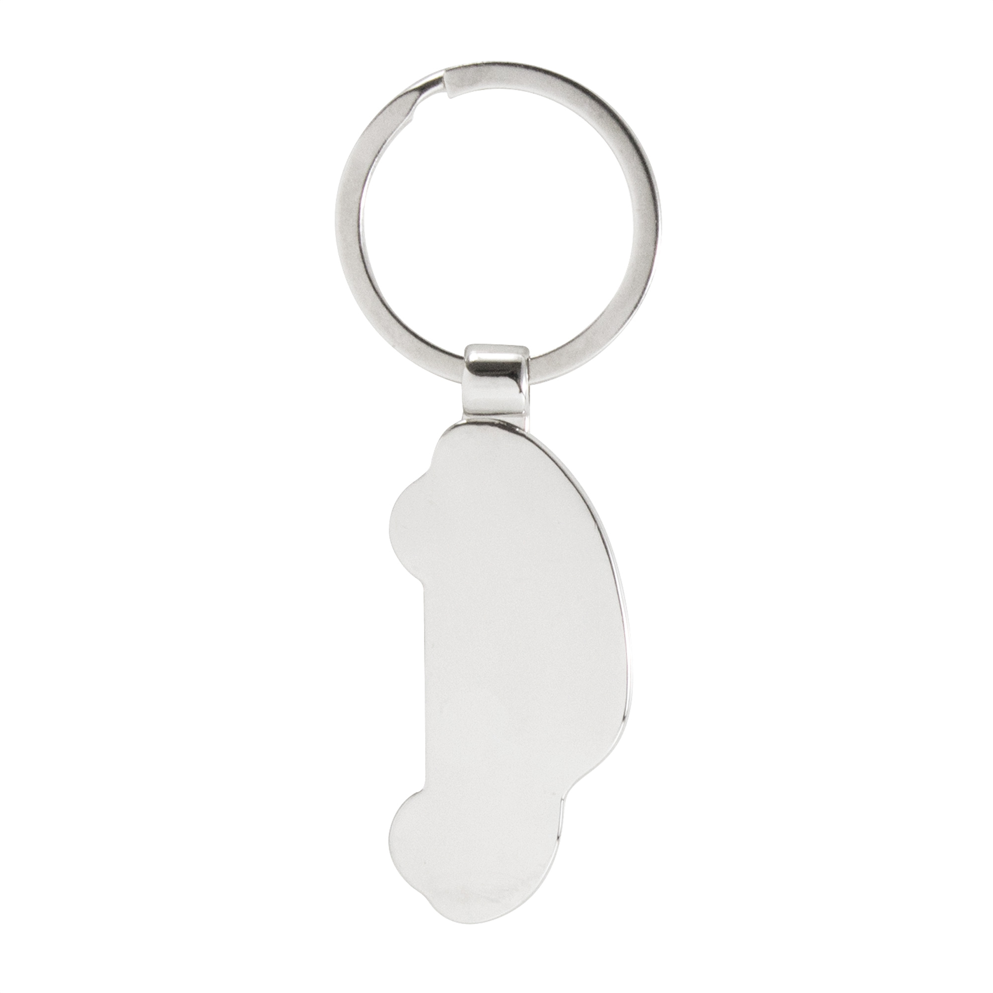 Llavero con forma de auto. Estructura metálica con aleación de zinc con acabado brillante y panel frontal de bambú barnizado.