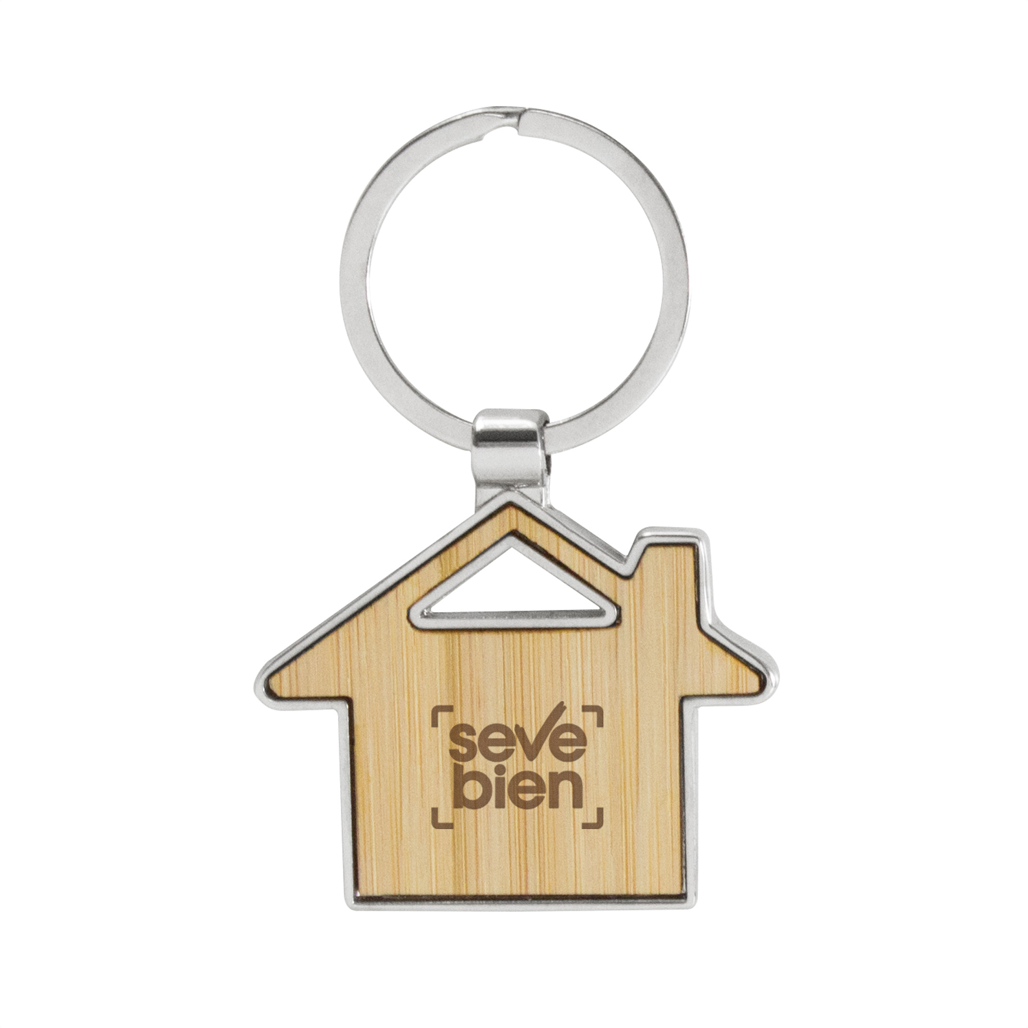 Llavero con forma de casa. Estructura metálica con aleación de zinc con acabado brillante y panel frontal de bambú barnizado.