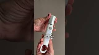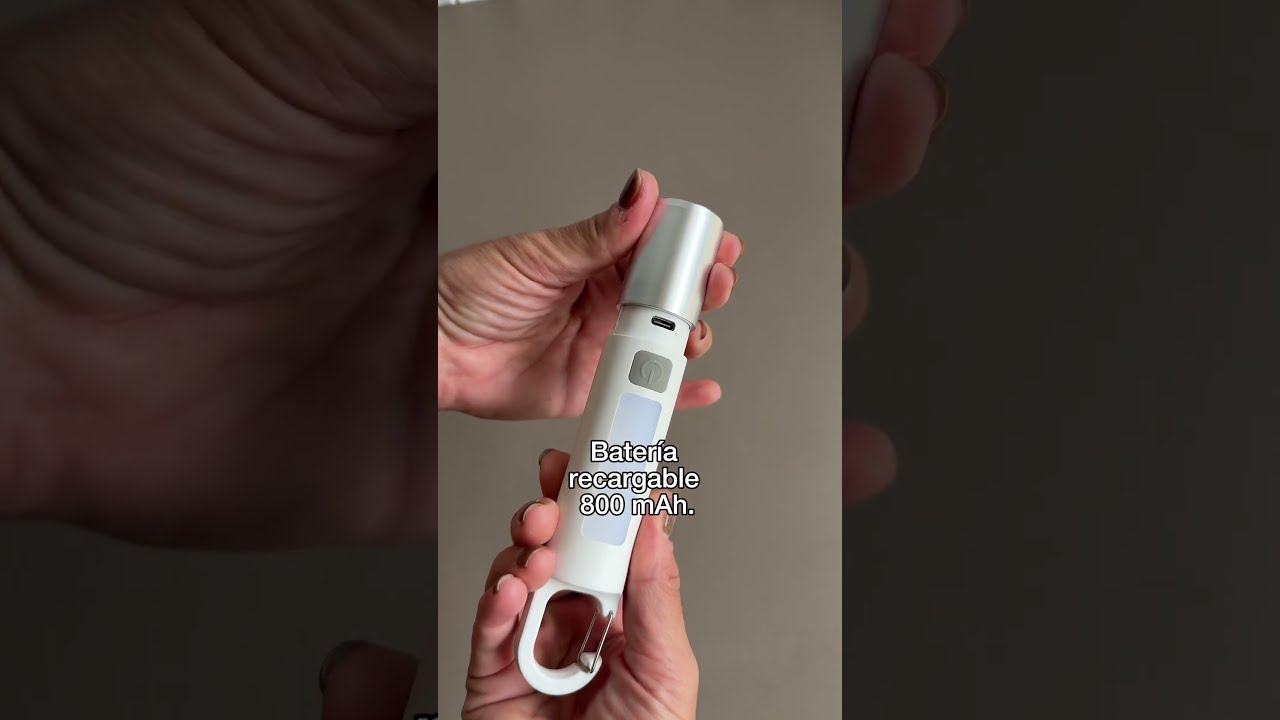Linterna portátil recargable. Con mosquetón incorporado. Luz de emergencia y 2 intensidades de iluminación (alta e intermitente). Batería recargable 800 mAh. Fuente de luz 7 leds de alta potencia. Puerto USB-C oculto (se desplaza el cuerpo hacia arriba). Cable de carga color blanco.